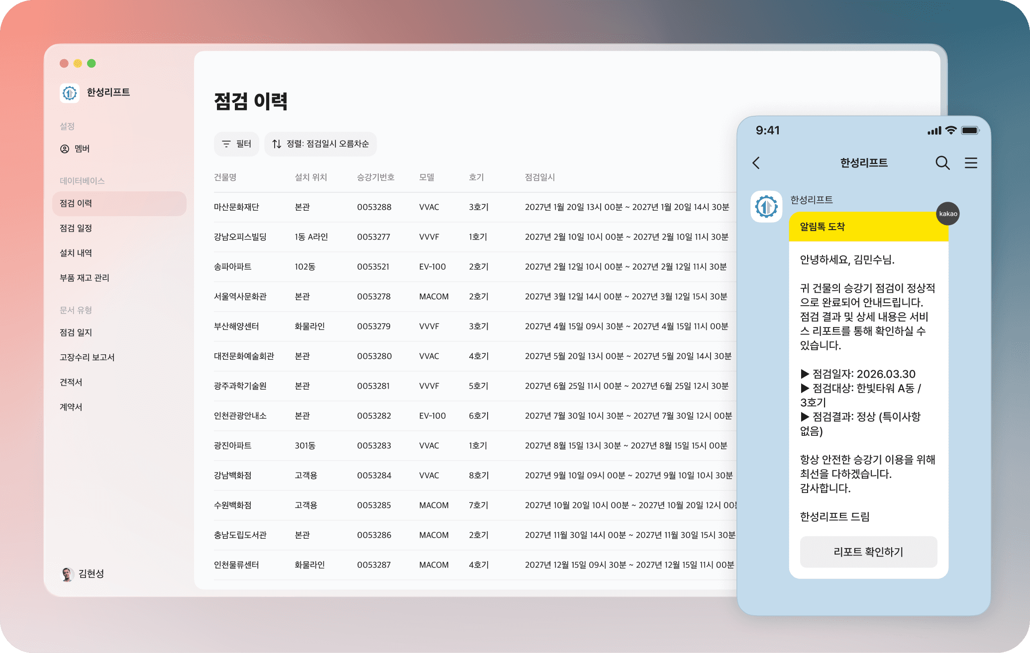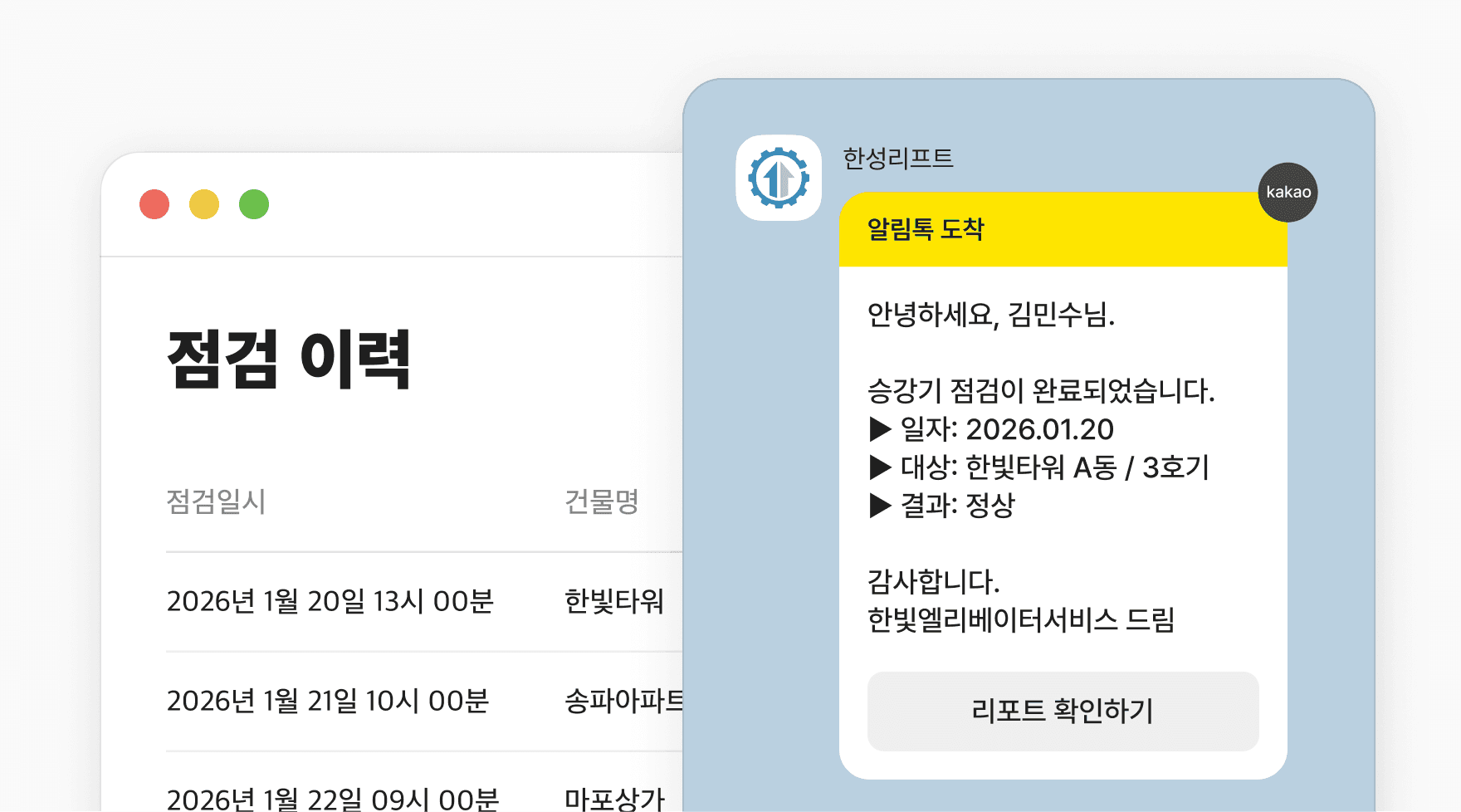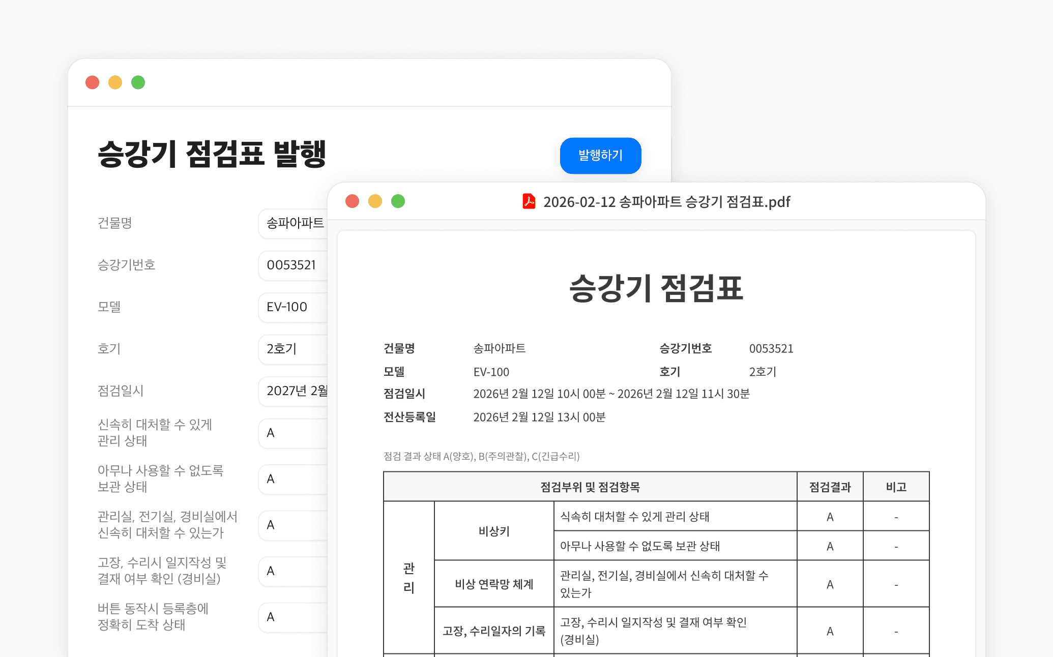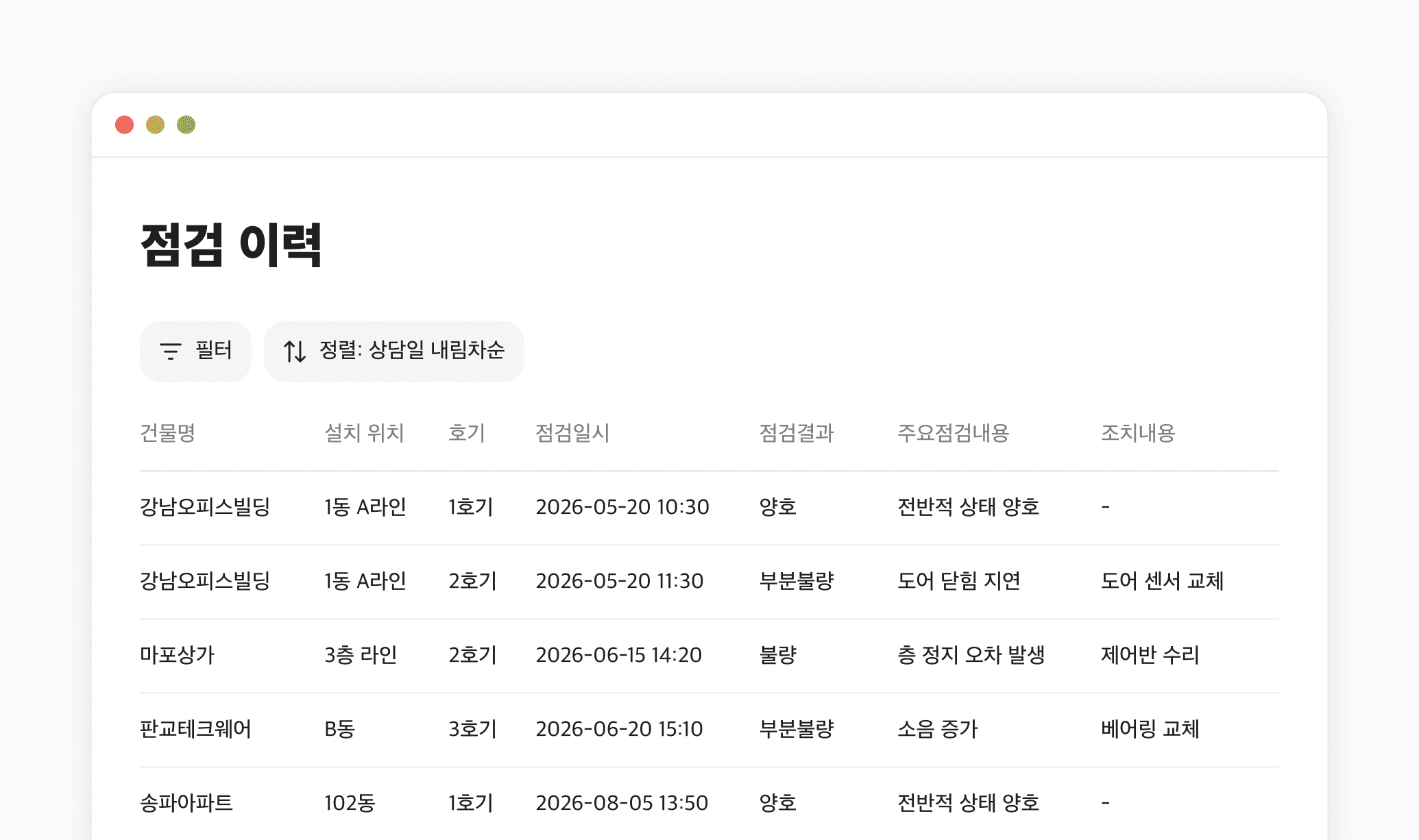 어느 건물, 몇 호기, 언제 점검했는지. 부품 교체 이력까지 모두 남습니다.