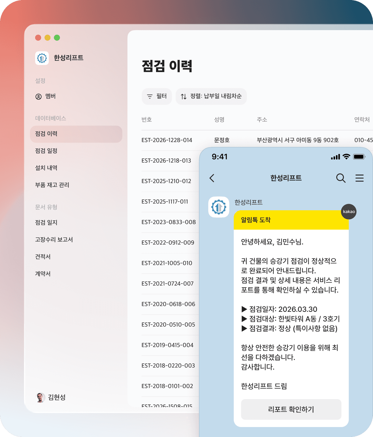 점검이 끝나면 고객에게 자동으로 발송됩니다. 전화 한 통 없이도, 우리 회사가 꼼꼼하다는 걸 고객이 먼저 느낍니다.