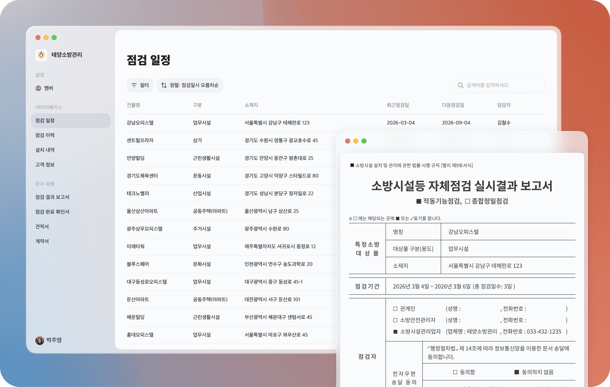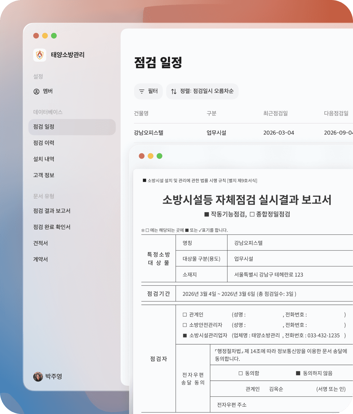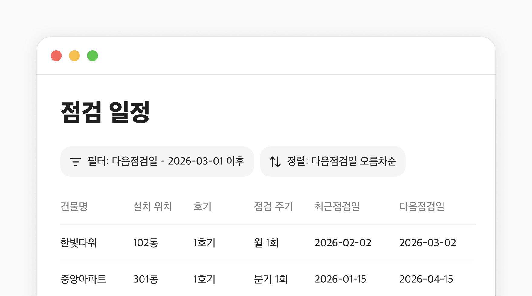 다음 점검까지 며칠 남았는지, 이번 달 방문해야 할 건물이 어디인지. 누락되기 전에 시스템이 먼저 알려줍니다.
