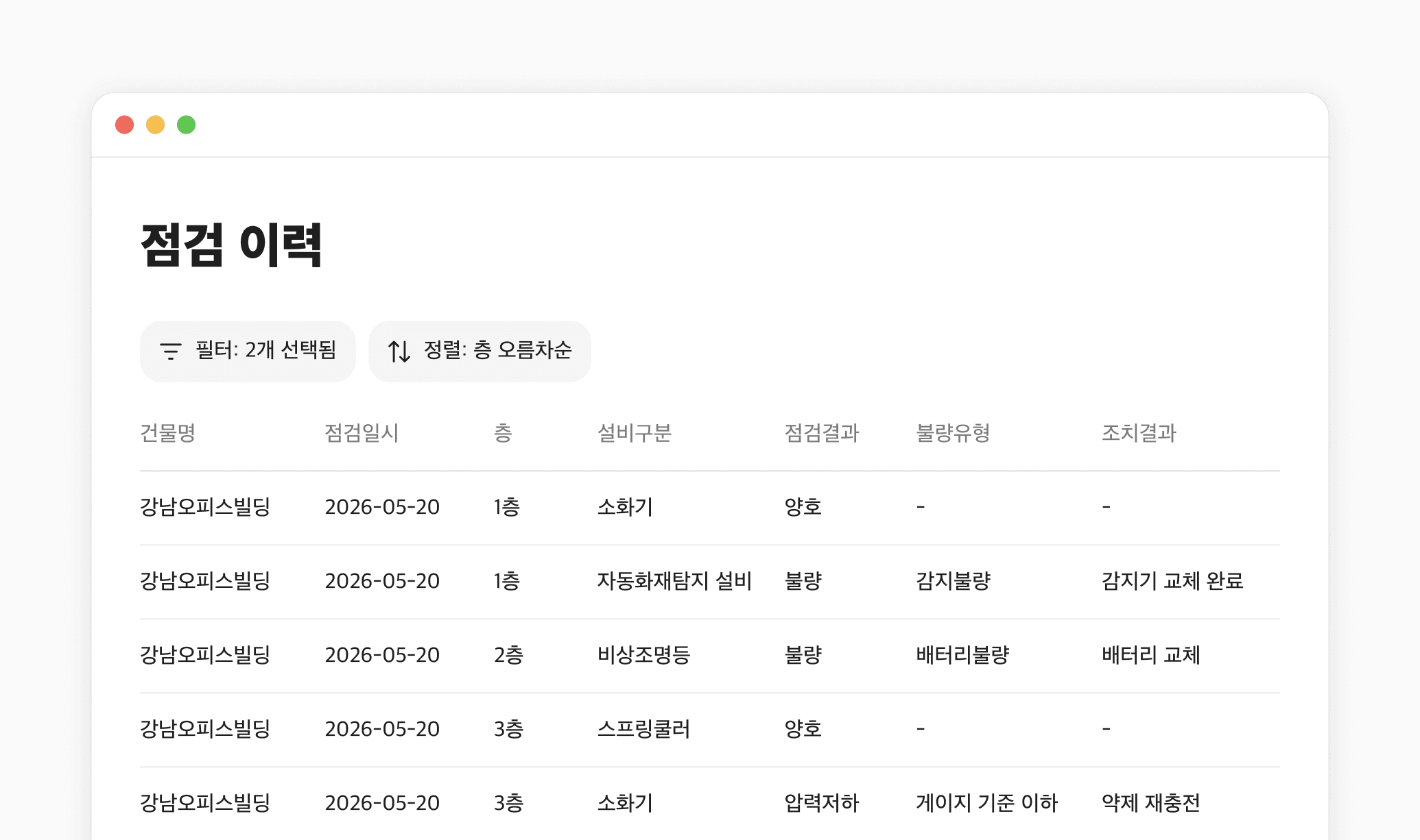 어느 건물, 몇 층, 어떤 설비를 점검했는지. 불량 사항과 조치 결과까지 모두 남습니다.