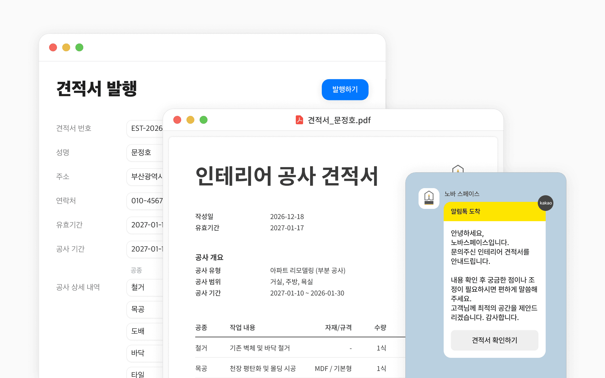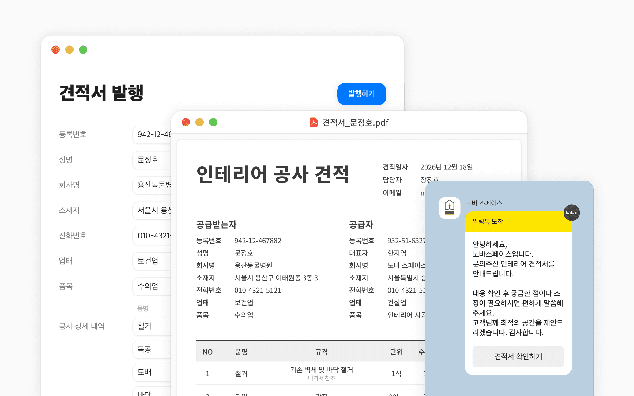 클릭 한 번에 견적서를 만들고, 카카오 알림톡으로 바로 발송.