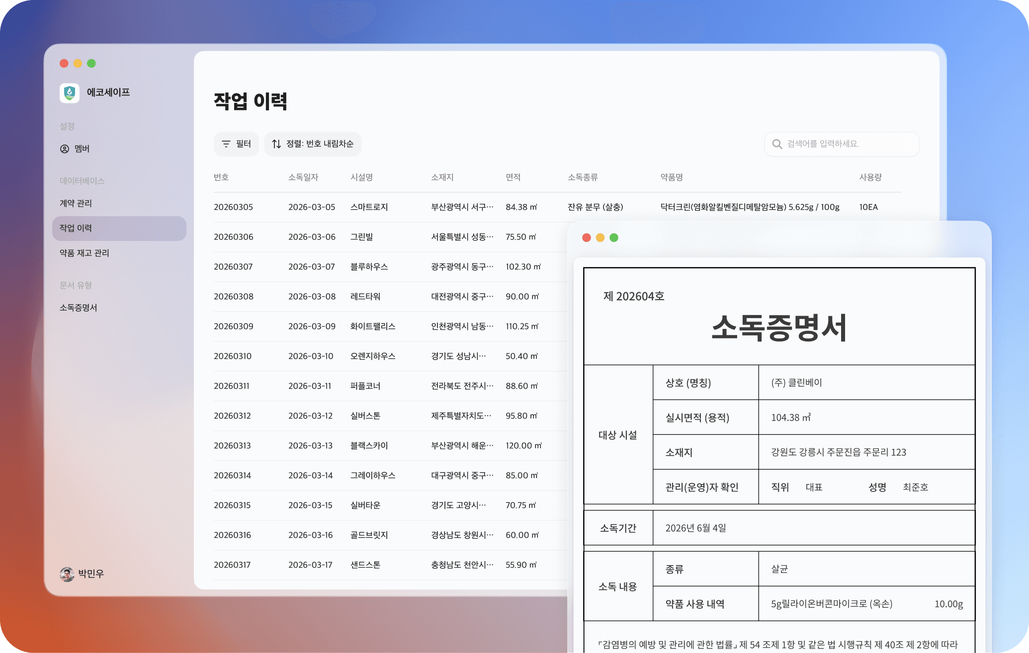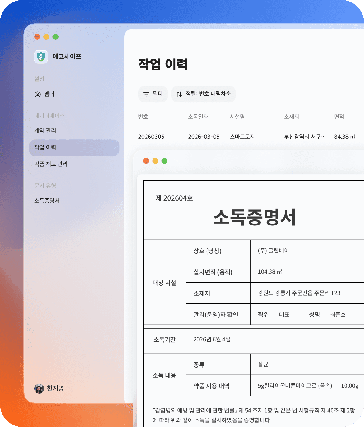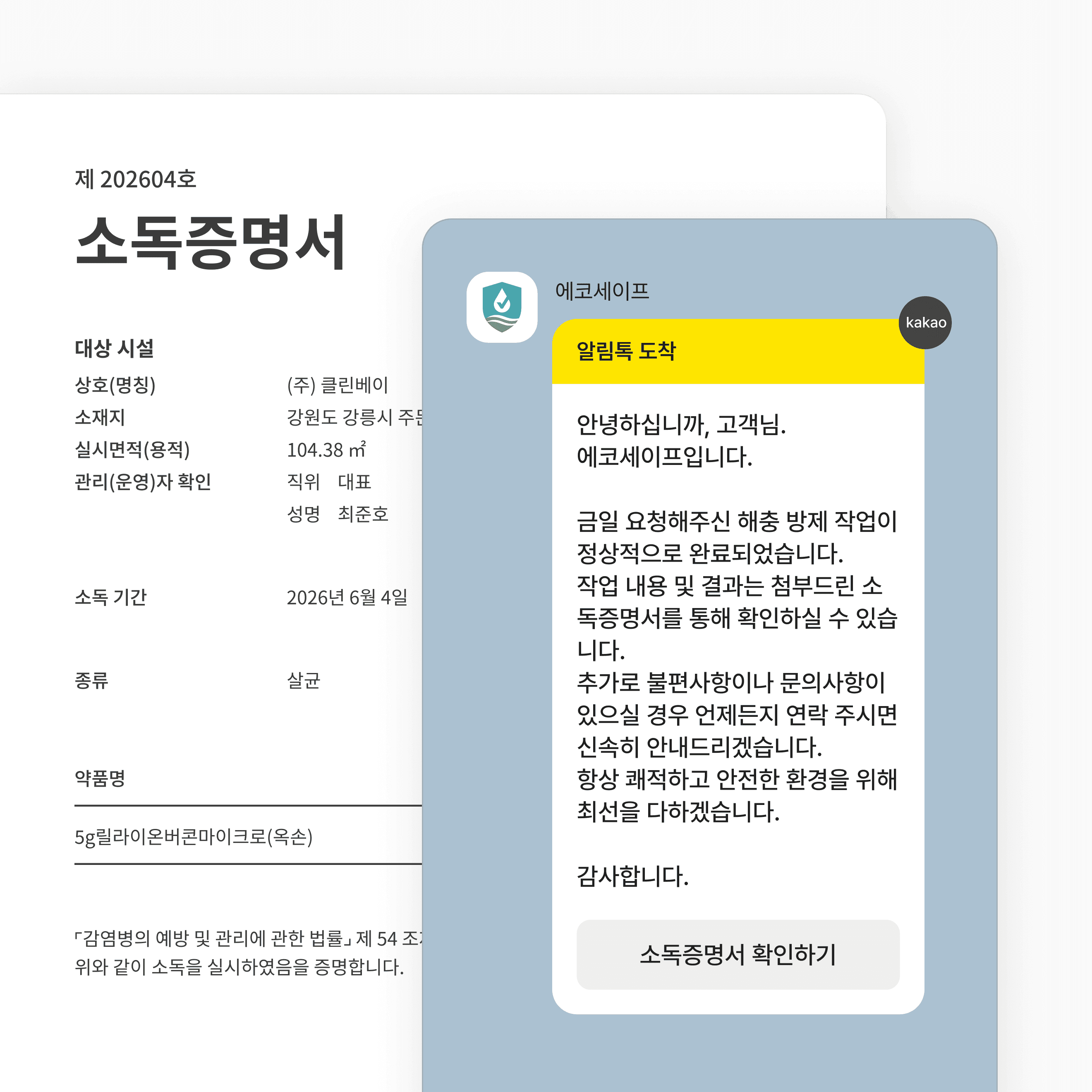 작업 이력을 저장하는 순간, 소독필증이 자동으로 완성됩니다. 고객사명, 작업일, 약품명, 사용량이 양식에 맞게 채워진 문서를 클릭 한 번으로 카카오 알림톡으로 바로 보낼 수 있습니다. 손으로 써서 사진 찍어 보내던 일, 이제 없습니다.