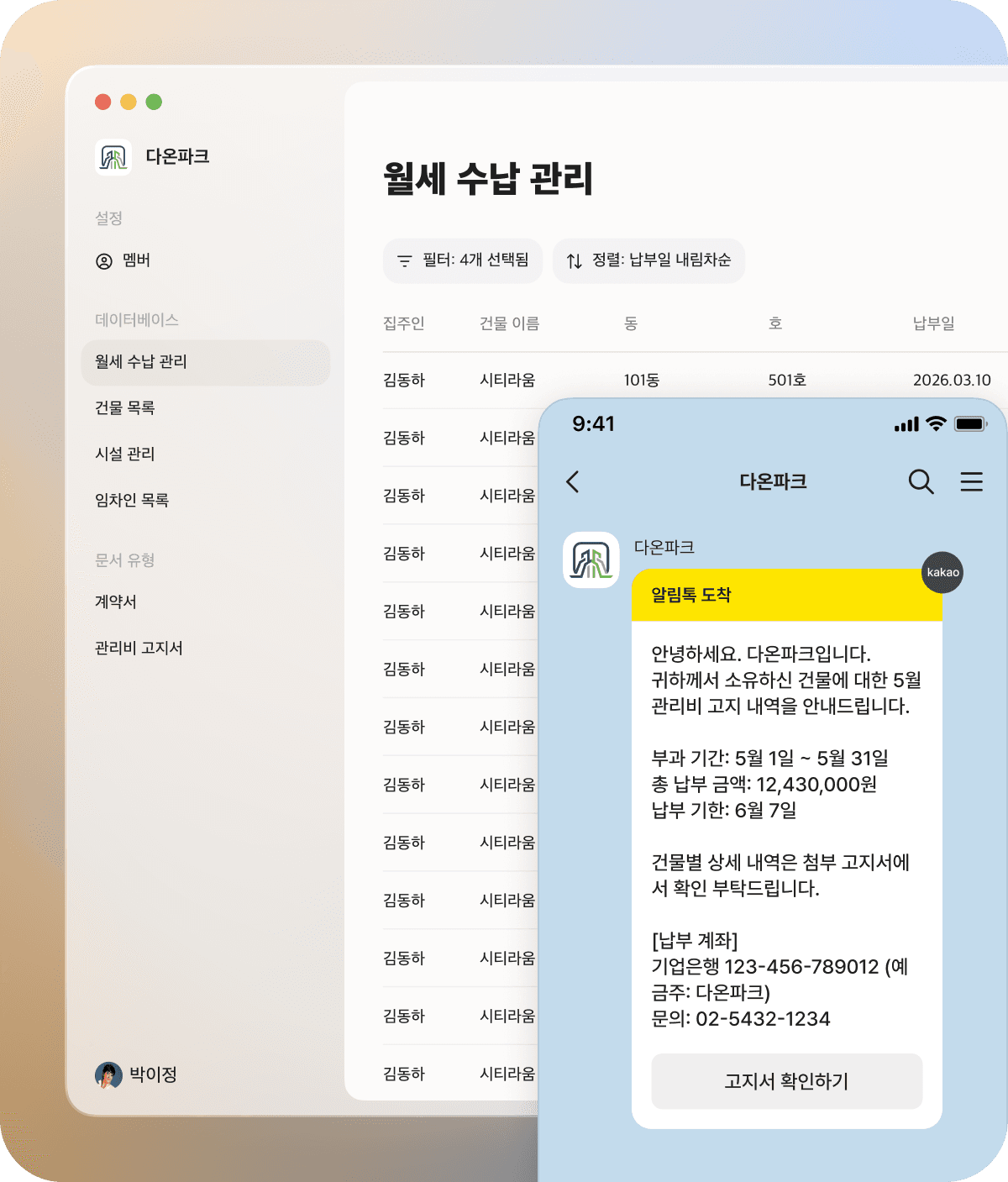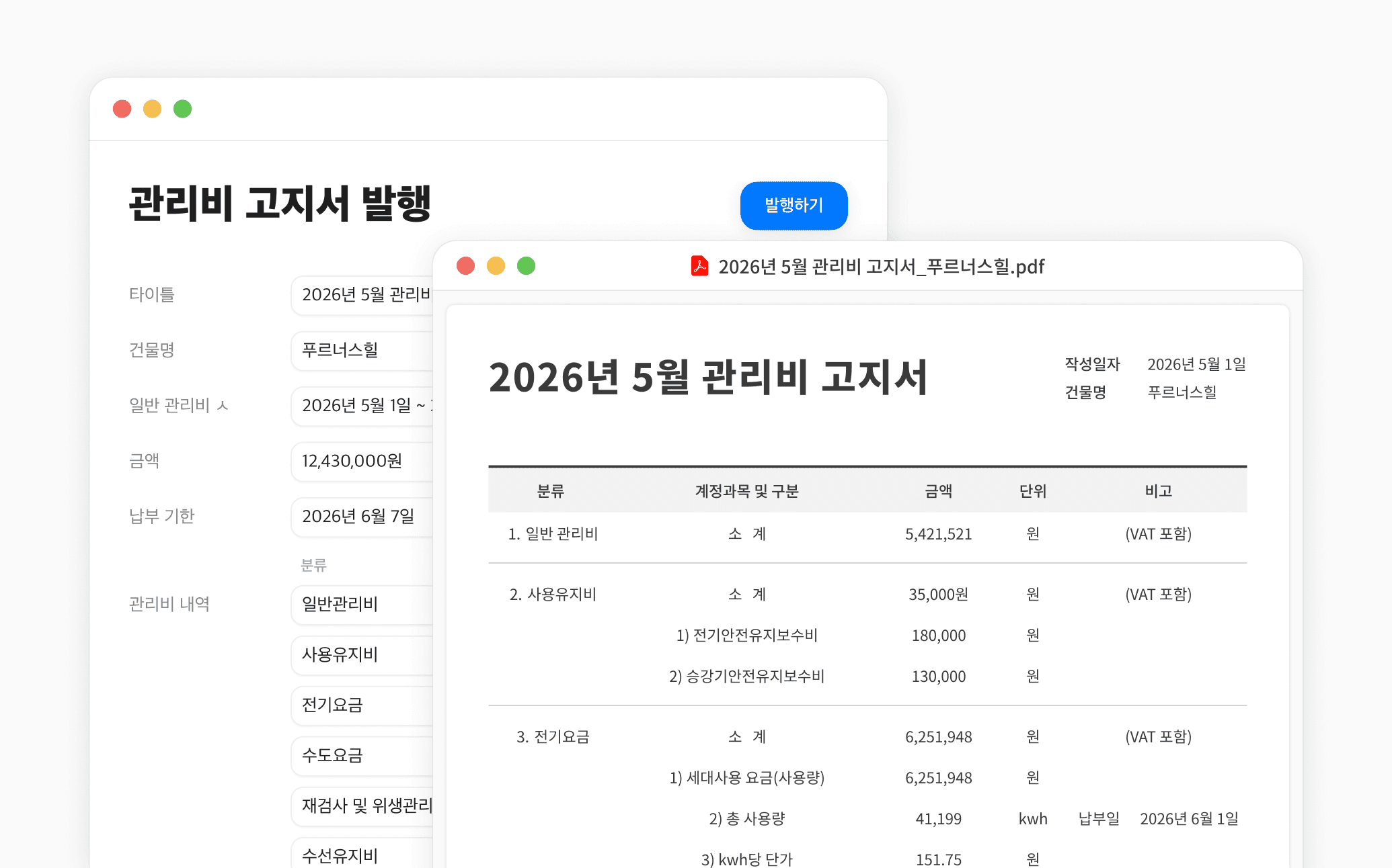 관리비 고지서, 견적서, 청구서도 건물별, 임차인별로 클릭 한 번에 자동 생성.